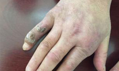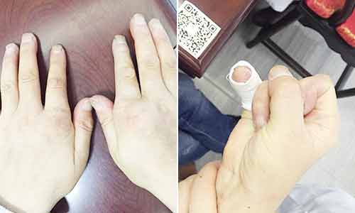 (图:治疗前患者握拳时左食指和右手小指受限)