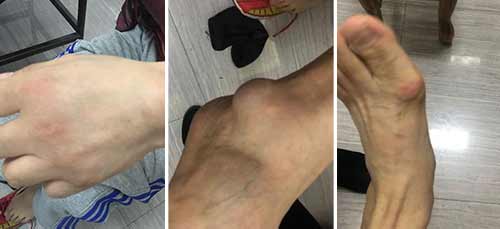 (图:来院看诊时,唐先生全身多处关节有大小不一痛风石)