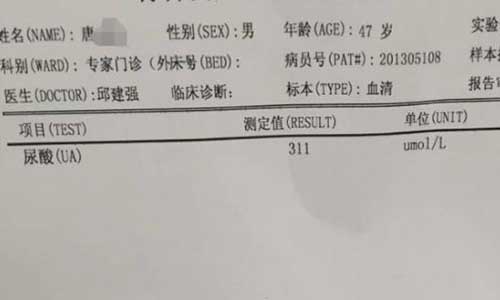 (图:治疗一个疗程后唐先生的血尿酸检查结果)