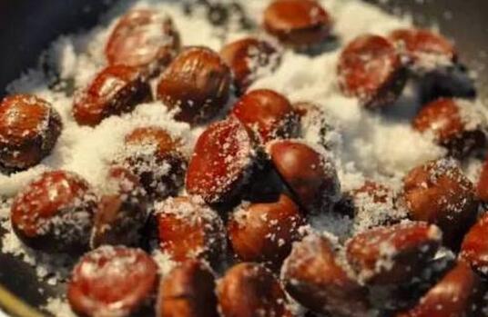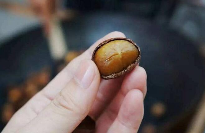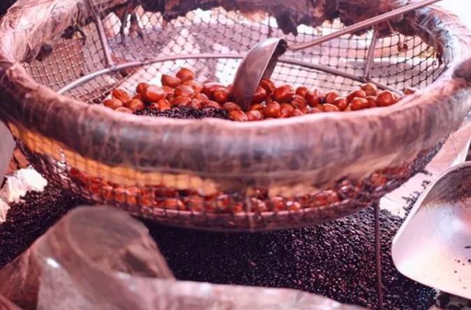 白糖炒制发黑的石晶砂和筛选过后的板栗,经过近30分钟的炒制,多次的火候调节,和数十次不间断的观察栗子状态,待栗子呈现出漂亮的金黄色,继续低温炒制,同时去除栗子底部的毛糙,让外壳更有光泽,让栗子的内皮与栗肉分离。炒熟后的栗子依旧要进行最后筛选,拣走有虫洞、裂壳的不合格品……