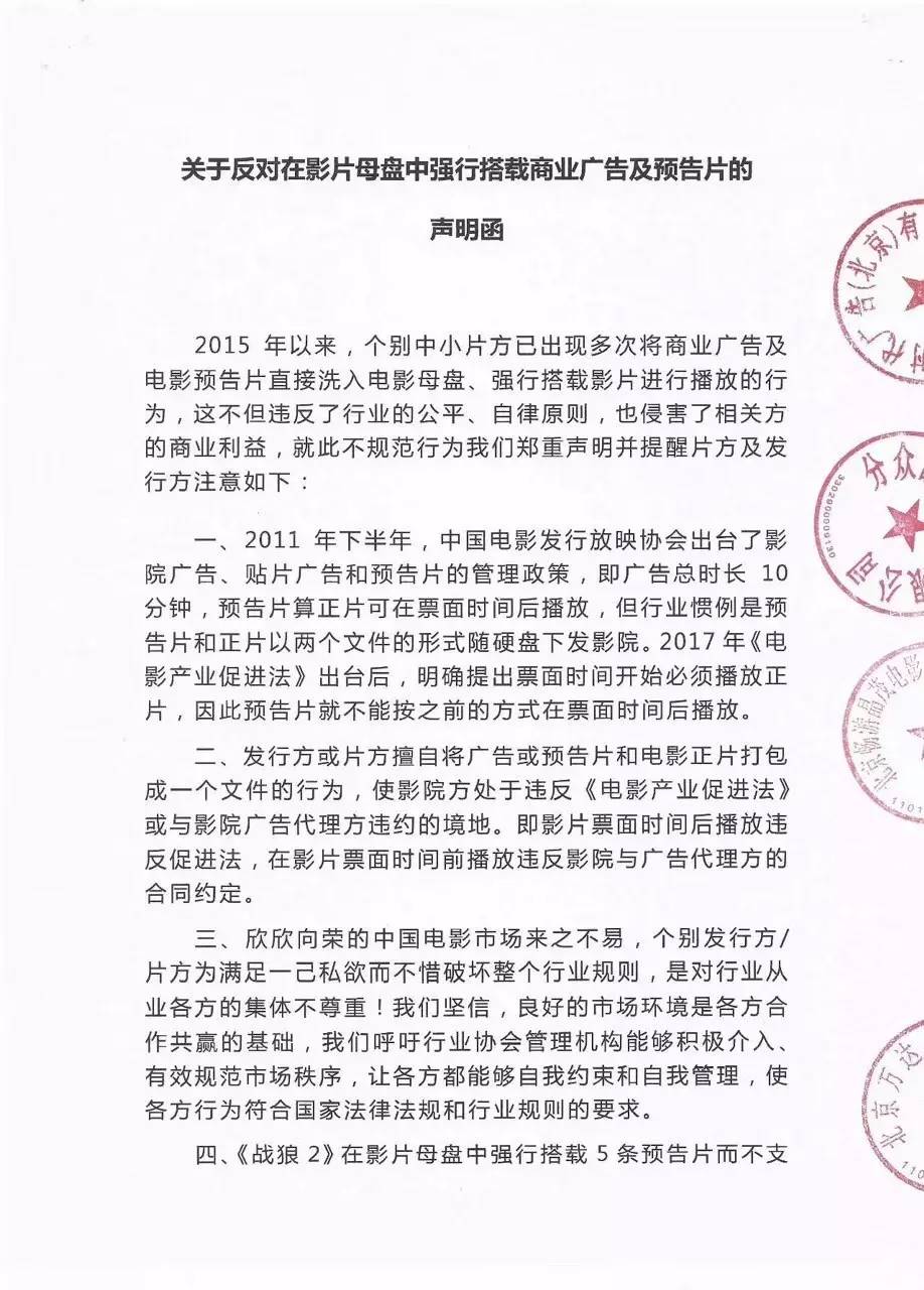 《战狼2》的5支预告片不是广告,影院应默认播放,若是商业广告那么需要和影院签订合同,根据播出场次来分成。