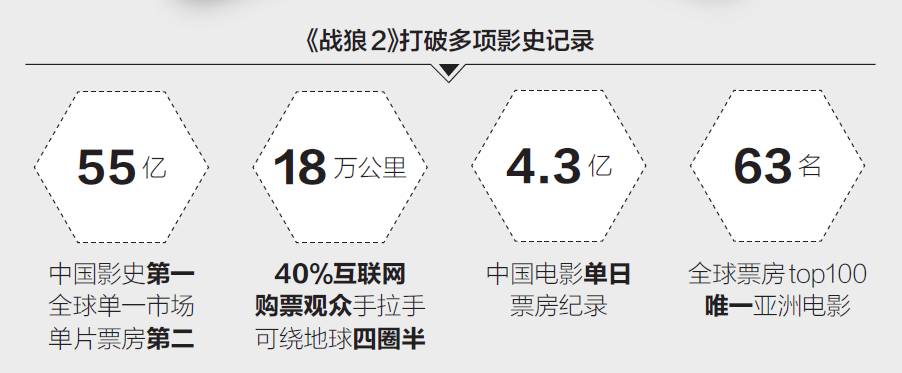 4小时破亿,12天打破《美人鱼》纪录成为中国影史第一,超越里程碑大片《泰坦尼克号》《阿凡达》成为全球单一市场单片票房亚军……截至9月4日,《战狼2》中国内地票房突破55亿元。