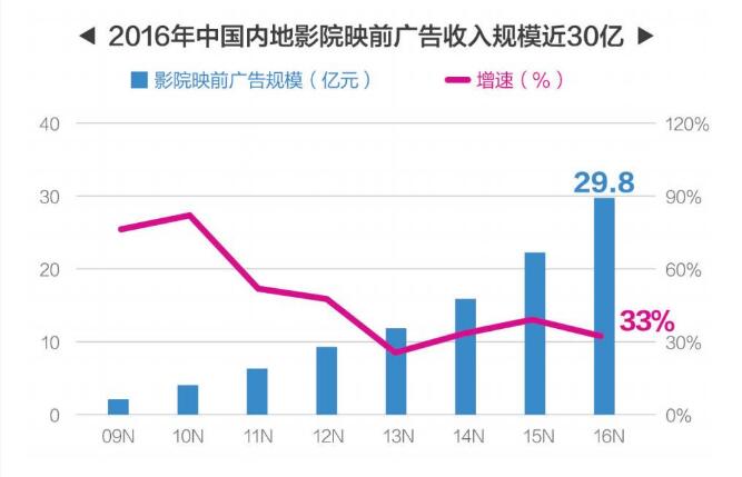 据艺恩咨询报告,2016 年中国映前广告收入接近30 亿元,同比增长33%。2017 年上半年中国整体广告市场同比上涨0.4%,映前广告收入同比增加19%,在九类媒体中增速最快,排名第一。广发证券研究认为,2017 年映前广告还将增长25%。