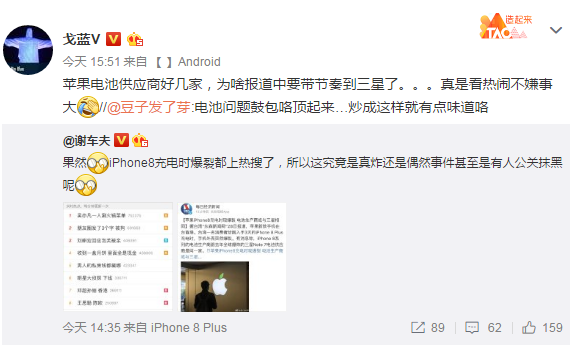 对此,三星前工程师@戈蓝v 吐槽表示,苹果电池供应商有好几家,为何要带节奏到三星……
