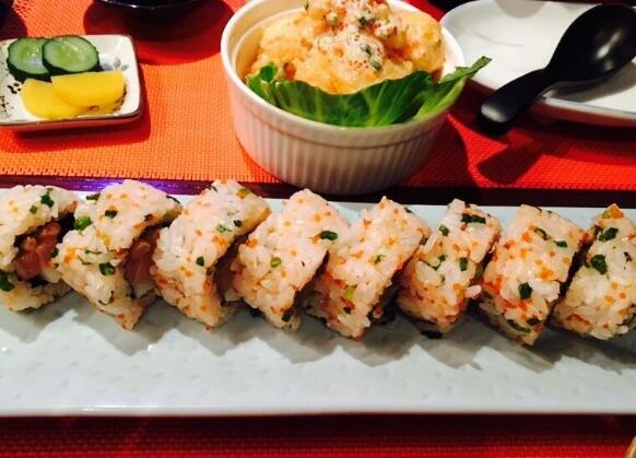 当天点了海鲜温泉蛋饭,要的全熟鸡蛋,生鱼片给的挺多,一碗味噌汤,米饭很香,搭配生鱼片味道超棒。刺身拼盘,有我喜欢的三文鱼、北极贝、金枪鱼等,三文鱼切得非常厚,非常大的一块儿,很新鲜。鳗鱼金枪鱼沙拉量真心好大,里面的金枪鱼和鳗鱼非常棒,一点腥味儿都没有!芥末章鱼是我来他家必须要点的,章鱼个头均匀,量也很足。大阪烧也称为日式的煎饼,厚厚的煎饼下面裹着鱿鱼,每次都可以自己吃一整份。加州卷里面是用金枪鱼、牛油果、黄瓜做的,超受欢迎,几乎每桌必点!