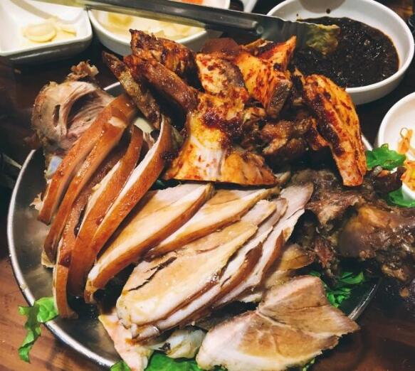 推荐:原以为只是不经意间的路过,谁知却给了我难忘的惊喜。第一次来吃,感觉一切都好新奇,可以碳烤的鸡蛋羹,石子垫底的烤鸡排,超大份特色芝士拌饭......每一份食物上来都有期待。首尔猪蹄拼是他家的特色,猪蹄是切好的,已经骨肉分离了,肉被切成一片片的,端上来已经是熟的了,里面还有鸡蛋卷、辣白菜、黄豆芽、青椒丝、黄瓜丝等,用生菜裹上猪蹄肉,再配上这些配菜还有蘸酱,味道别提多香了。辣烤小章鱼味道新鲜,有嚼劲儿。章鱼是用辣酱腌制好的,个头很大,服务员需要把它剪成一块一块的再烤。干拌凉面里面配料有鸡蛋、辣白菜、黄瓜、果仁、洋葱,面很筋道,味道清爽不腻,值得品尝。