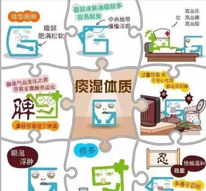 什么样的人是痰湿质呢?中医辨证的痰湿体质多是肥胖人群,这些人素体阳气不足,不耐寒冷,平素嗜食肥甘厚味,喜烟酒,易患高脂血症、高尿酸血症、代谢综合征等代谢性疾病。具体的临床表现为体态呈向心性肥胖,口中不渴,口感黏腻,口味多甜,肢体自觉沉重,舌体胖大,舌苔白腻,脉濡或滑。