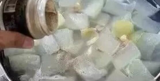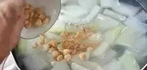 第三步,下锅加水加些姜片煮到冬瓜水晶透明,加入泡好的海产品。