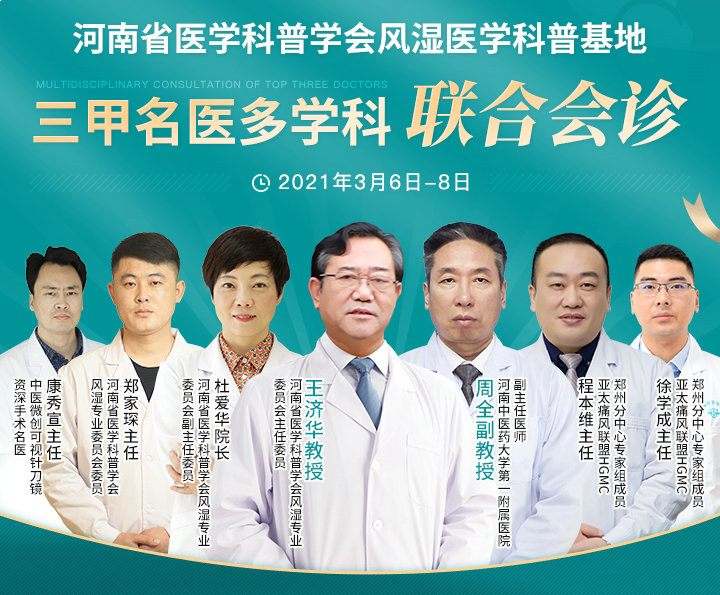 为此,在2021年3.8节来临之际,由河南省医学科普学会风湿医学科普基地——郑州痛风风湿病医院,于3月6日-8日,特开展“关爱女性健康”3.8节风湿骨病公益援助筛查暨河南省医学科普学会风湿医学科普基地三甲名医多学科联合会诊”。此次,河南中医药大学第一附属医院王济华教授、周全副教授,郑州痛风风湿病医院杜爱华业务副院长,程本维主任、徐学成主任、郑家琛主任、康秀宣主任等知名医师将开展多学科联合会诊,旨在帮助广大风湿骨病患者明确检查、规范治疗、科学预防,远离病痛,避免因病致残,早日回归正常生活。