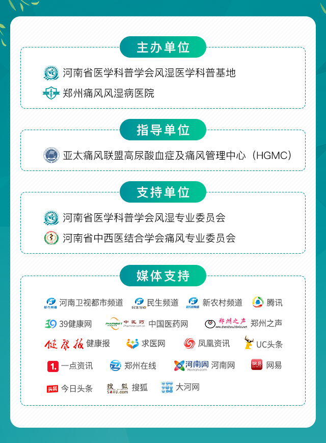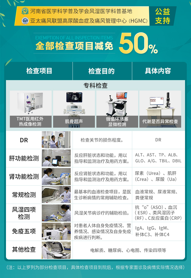活动期间,提前预约到院后,痛风/风湿骨病患者即可享受由河南省医学科学普及学会风湿医学科普基地、亚太痛风联盟高尿酸血症及痛风管理中心(HGMC)公益支持普查援助:全部检查项目减免50%。