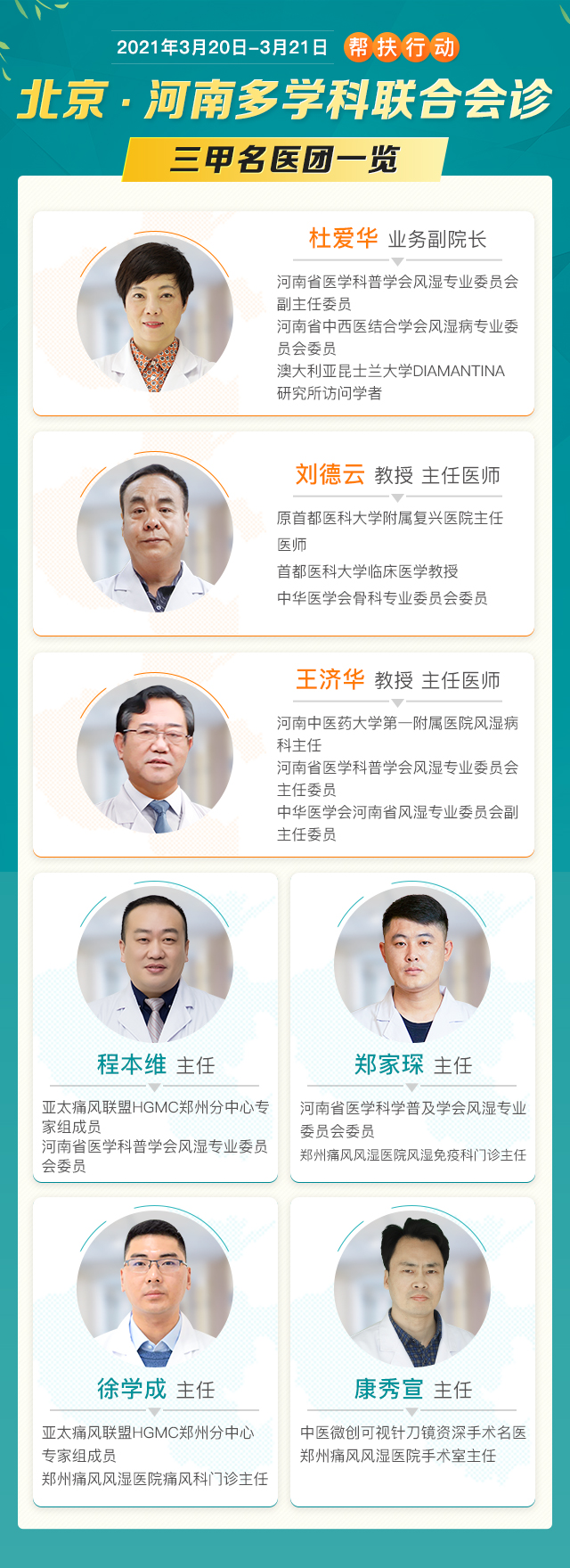 为此,河南省医学科学普及学会风湿医学科普基地、亚太痛风联盟HGMC郑州分中心——郑州痛风风湿病医院,于3月20日-21日,特开展“2021年春季痛风/风湿骨病抗复发规范诊治帮扶行动暨北京河南名老教授领衔三甲名医(MDT)多学科联合会诊”。本次,原首都医科大学附属复兴医院刘德云教授,河南中医药大学第一附属医院王济华教授,郑州痛风风湿病医院杜爱华业务副院长,程本维主任、徐学成主任、郑家琛主任、康秀宣主任等知名医师将开展多学科联合会诊,旨在帮助广大痛风/风湿骨病患者阻断病情,避免病情复发,早日回归正常生活。
