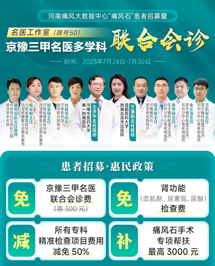 在临床中,痛风风湿骨病引起的肾脏病变并不少见,广大患者自身要引起重视,定期进行肾功能必要检查,做到早发现、早治疗,避免延误病情。为此7月28日-30日,“名医工作室|京豫三甲名医联合会诊”活动将启动,并为患者提供『肾功能0元免费查』在内多项惠民补贴。具体详情如下