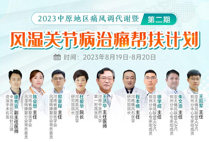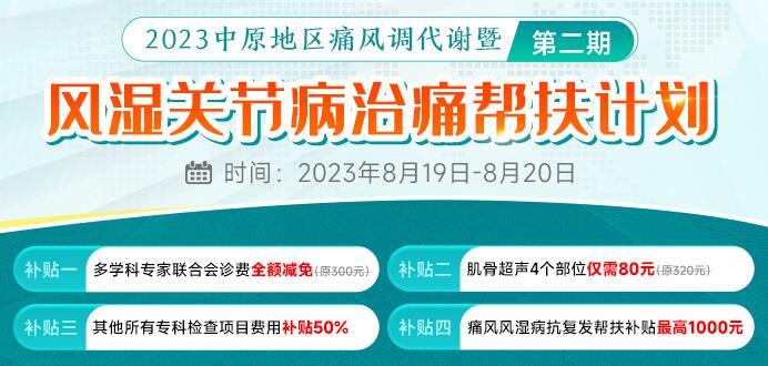 为帮助广大患者进行科学规范治疗,我院将于8月19日-20日,开展“2023中原地区痛风调代谢暨风湿关节病治痛帮扶计划(第二期)”活动。旨在通过优质名医资源和先进诊疗技术的有力支持,让患者尽早摆脱病痛困扰,回归正常生活。
