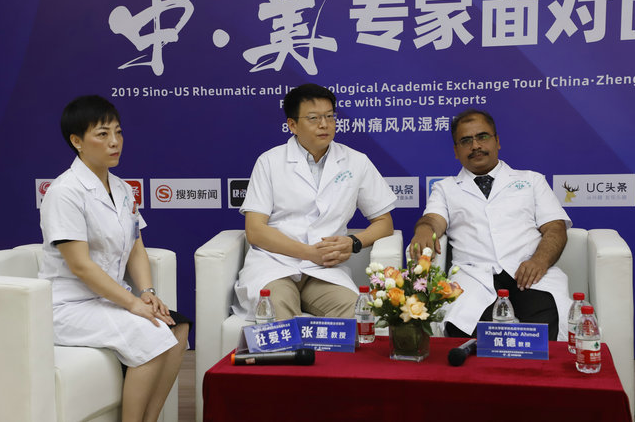 (图:杜爱华院长与美国麻省大学医学院、清华大学免疫学研究所教授Aftab Ahmed Khand教授及北京武警总医院张墨教授面对面解答患者风湿免疫病疑问)